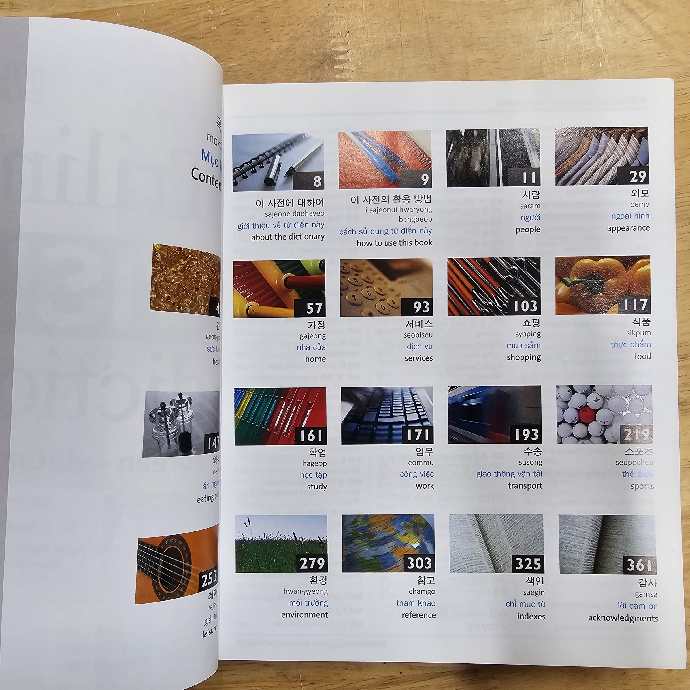 Cuốn từ điển được chia thành 20 chủ đề hình ảnh quen thuộc trong đời sống – học tập – công việc, bao gồm: